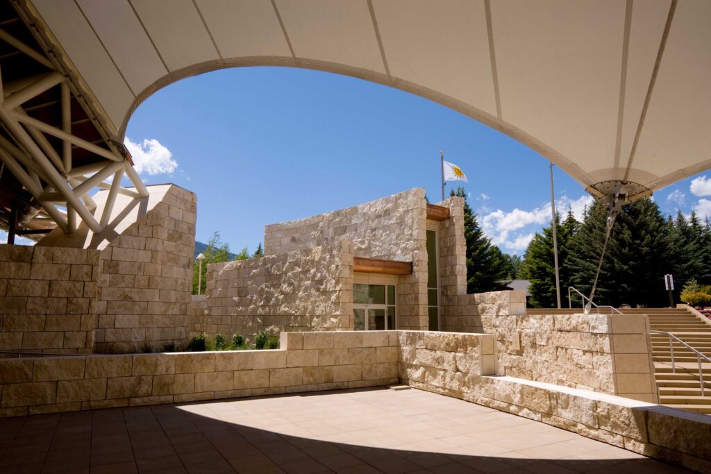 The fabric tensile structure covering the 1,500 seat amphitheater was inspired by its setting, located in Idaho’s premier winter and summer alpine resort. The sky and mountains are captured by the seasonal luminous tensile fabric roof covering the seating areas and the permanent copper clad tensile steel roof system covering the performance and support areas. Home of the Sun Valley Music Festival, the R.E. Holding Pavilion is located on the southern end of an open village meadow adjacent to the historic Sun Valley Lodge and nestled into existing contours on the site to form a natural amphitheater.